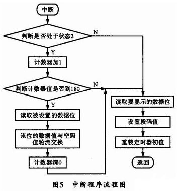 在狀態(tài)2下,參數(shù)設(shè)定時,設(shè)定位要實現(xiàn)閃爍,以確定正在被設(shè)置的數(shù)據(jù)位。實現(xiàn)閃爍的基本思想是每隔500 ms,當前閃爍數(shù)據(jù)位的段碼值就由數(shù)據(jù)狀態(tài)變?yōu)榭沾a狀態(tài),下一個500 ms再由空碼狀態(tài)變?yōu)閿?shù)據(jù)狀態(tài),并不斷循環(huán)執(zhí)行此操作(共陽極顯示方式下空碼值為0XFF)。這樣,從用戶角度看,當前被設(shè)定的數(shù)據(jù)位就是閃爍的。這里可通過設(shè)定一個計數(shù)器來確定轉(zhuǎn)換時間,當計數(shù)值達到500/2.78(約為180)時,當前閃爍數(shù)據(jù)位就進行段碼值轉(zhuǎn)換。本系統(tǒng)的中斷程序流程圖如圖5所示。