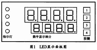 本文的LED通用智能型顯示面板如圖1所示。該面板中央為兩排LED數(shù)碼管,每排4位。上排為紅色,下排為綠色。面板左邊為四個發(fā)光二極管,右邊為四個按鍵開關(guān)。其顯示和開關(guān)可根據(jù)不同應(yīng)用定義。