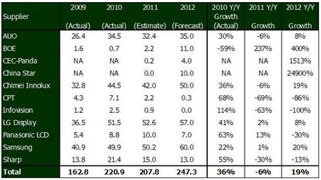 中國大陸的新進面板廠商京東方、華星光電與中電熊貓等也都在2012年隨著其大世代線的量產(chǎn)設下了相當積極的出貨目標;而一些生產(chǎn)較小尺寸液晶電視面板的廠商如華映與龍騰等則會在2012年逐步退出電視面板市場。