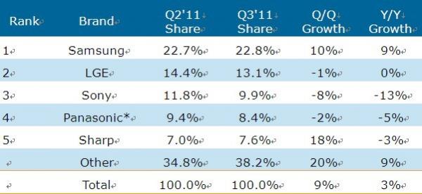 2011年第三季三星全球平板電視營收占比微幅提高,為22.8%,遠遠領先第二大品牌商樂金電子。就營收而言,除了在日本沒有出售電視,三星在全球其他各個地區(qū)營收第一,在亞太地區(qū)和拉美地區(qū)領先于樂金電子。三星液晶電視和等離子電視營收居于首位,CRT電視居第二位,并是五大品牌商中唯一一家營收同比成長的品牌商。