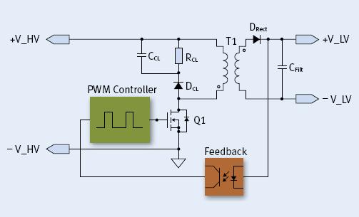 對于最高約100W的隔離電源,反激式拓撲已被廣為接受,因為它相對簡單,構(gòu)成元件少,具有成本效益優(yōu)勢且性能合理。借助飛兆半導體應用手冊AN-4137,其基本工作原理簡單并易于解釋。當MOSFET Q1導通時,變壓器T1初級端中的電流線性斜升,建立了一個儲存能量的磁場,變壓器繞組的極性點顯示極性滿足條件以致次級端整流器DRect在此期間關(guān)斷。一旦MOSFET斷開,根據(jù)楞次定律(Lenz''s law),跨越變壓器的所有電壓的極性反轉(zhuǎn)。DRect現(xiàn)在開始導通且儲存在T1中的能量傳送到電容器CFilt中。PWM控制器的占空比(Duty cycle)和變壓器圈比一起決定輸出電壓,其在隔離反饋網(wǎng)絡(luò)的幫助下是穩(wěn)定的。因為初級和次級之間的不完全耦合,即漏電感的存在,網(wǎng)絡(luò)DCL、CCL 和RCL鉗位電壓突升。這對于減少Q(mào)1的電壓應力是重要的,但同時也是功率損耗的一個來源,因為RCL中的能量被消耗了。