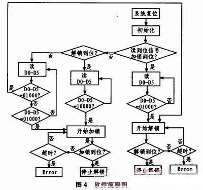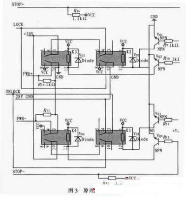 當(dāng)信號D0-D5為10000時,單片機通過P10口對方位鎖定機構(gòu)發(fā)出加鎖命令,控制命令經(jīng)SN54LS245驅(qū)動后作用于R9和VQ1,VQ1導(dǎo)通后,繼電器K2的4、5導(dǎo)通,輸出+28 VLOCK信號控制電機進行加鎖。完全鎖定后,光電開關(guān)輸出(上)信號輸出高電平即圖3中STOP+,STOP+通過上拉電阻R16作用于R10和VQ2,VQ2導(dǎo)通后,繼電器K3的4、5和8、9導(dǎo)通,+28 V LOCK信號切斷,硬件上先停止加鎖控制,防止造成機構(gòu)硬件損傷。而K3的8、9導(dǎo)通后,F(xiàn)WH+輸出+5 V電平給單片機,單片機接收信號后,終止加鎖命令,VQ1截止,K3恢復(fù)常態(tài)。解鎖過程和加鎖過程類似,在此不作贅述。