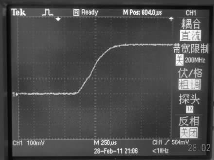 通過模擬可初步選擇40 mH 的電感作為驅動電路所用, 圖3 是用示波器采到的電壓波形圖, 此電壓是電路中串聯了一個20 Ω 的電阻上的電壓, 穩(wěn)定后電壓為340 mV, 即電路中電流為17 mA.因為實際電路中電流有損耗, 所以實際電流值比模擬電流值偏小, 但整個電流的變化趨勢與模擬基本一致。