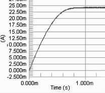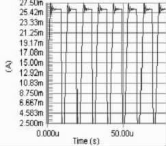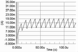 要保證PWM 周期小于電感的τ 時間, 因為若PWM 的周期大于τ, 則極有可能出現在PWM 的占空比變化的情況下, 電路中電流都能達到電感的飽和直流電流, 影響了對LED 電流調節(jié)。當C8051330 的時鐘頻率是25 MHz ,PWM 的周期的選擇對電流改變檔位的影響很大。若周期越大, 則PWM 占空比的檔位越多, 反之越少。擬用256 個檔位的占空比, 因此PWM 波的頻率應選擇在100kHz 以下,即周期在10 μs 以上,直流電感為10Ω, 此時電感值應選擇大于0.1 mH.圖2 分別是PWM 頻率為100kHz , 占空比為90%, 電感為0.1 mH、1 mH 和40 mH 時電路電流值的模擬結果。