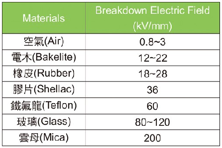 表1 各種絕緣材料的崩潰電場