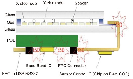 圖2中所示,即為觸控面板中最常發(fā)生靜電放電問題而需要防護(hù)的所在,由前面的解析可知,在結(jié)構(gòu)的物理特性及外在的靜電電壓雙重作用下,必然有極限值存在,超過此極限值後,就必需在系統(tǒng)的電路設(shè)計上加強(qiáng)防護(hù),如隔離層與內(nèi)部訊號之地線間,甚至是在內(nèi)部電源到地線間,都是必需被箝制的端點(diǎn)。一般內(nèi)在投射型觸控面板在訊號上較少出現(xiàn)直接從表面保護(hù)層崩潰來的直接電流,多是耦合問題影響到電源;因此除非在其物理限制已達(dá)極限,感測訊號才需要如表面接觸型面板增加箝制元件。