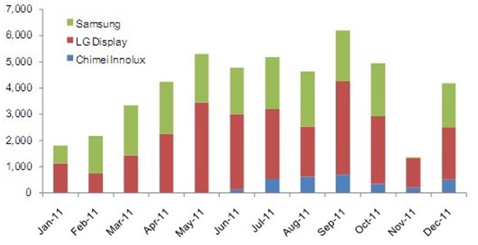 2011年9.7" iPad平板電腦面板出貨達(dá)到了4千8百萬片。雖然面板廠商之前的出貨預(yù)期更高,但受到了第四季度庫存調(diào)整的影響而最終無法達(dá)到2011年全年5千萬片以上的目標(biāo)。2011年的9.7寸面板出貨以XGA(1024x768)規(guī)格為主,亮度要求為400nits以上;且采用了IPS或FFS規(guī)格的廣視角技術(shù),而主要的面板供貨商為韓國的三星、LG Display與臺灣的奇美。根據(jù)NPD DisplaySearch每月TFT LCD面板出貨報(bào)告(Monthly TFT LCD Shipment Database),三家9.7寸面板供貨商在2011年的出貨各有千秋,如下圖所示。