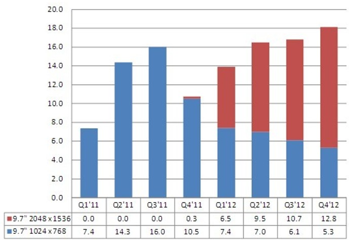 • 2012年,9.7寸iPad 面板出貨預(yù)計(jì)將可達(dá)6千5百萬片以上