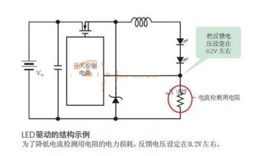 通常,開關(guān)穩(wěn)壓器IC設(shè)定的反饋電壓約為1.2V。但對于LED驅(qū)動IC,1.2V過大。因為把輸出電流轉(zhuǎn)換成電壓的數(shù)百mΩ 的電阻(電流檢測用電阻)需要與LED串聯(lián)。對于照明器具等使用的高亮度LED,流經(jīng)的是1.5A和2A等大電流。如果500mΩ的電流檢測用電阻中通過1.5A的電流,僅此一項就會產(chǎn)生0.75W的電力損耗。因此,LED驅(qū)動IC把反饋電壓設(shè)定在了非常低的0.2V左右。這樣一來,不僅可以使用較小的電流檢測用電阻,而且在大電流通過時,也可以把電力損耗控制在較低的水平。
