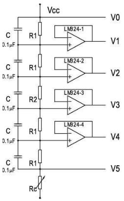 在圖1中,在各輸出端增加了運算放大器LM324。LM324是一個具有四運放的可使用正負(fù)電源工作的運算放大器。它的每一個運放都接成電壓跟隨器的形式,使得V1、V2等輸出端的驅(qū)動能力大大增強,可以大大改善LCD的對比度。電路中的Rc為10~20kΩ的可變電阻,在模塊對外部的接口處引出,可以隨時調(diào)整顯示的對比度。