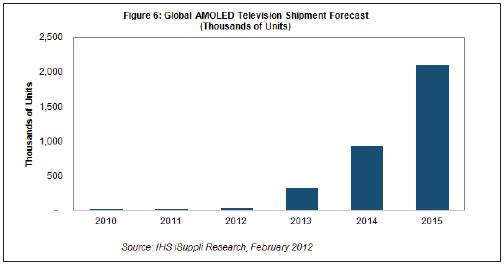 據(jù)IHS iSuppli公司的中小顯示器研究報(bào)告,2015年全球AMOLED電視出貨量預(yù)計(jì)將達(dá)到210萬(wàn)臺(tái),而2012年只有3.4萬(wàn)臺(tái)。雖然增幅巨大,但到2015年AMOLED電視在全球平板電視市場(chǎng)中的份額仍然將只有1%。