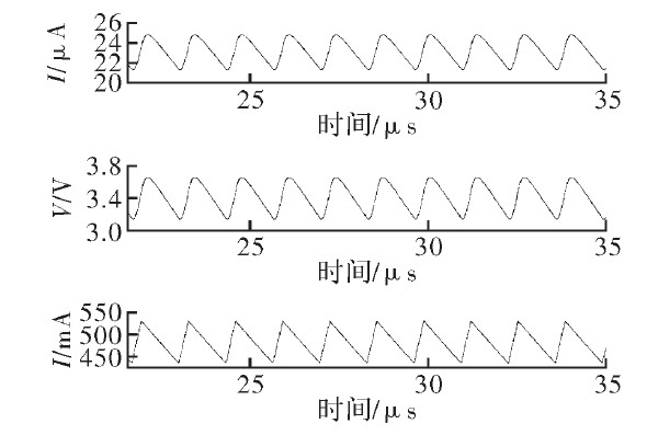 為驗證文中提出的電流采樣電路的功能,結(jié)合滯環(huán)控制電路及外部負載在Cadence中進行了仿真。圖5為輸入電壓20 V時采樣電流、電壓與負載電流的關(guān)系。由圖可見,采樣電流與采樣電壓隨負載電流同相周期性變化,周期約為1.2μs.