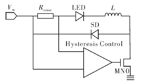 圖1是滯環(huán)控制電路框圖。LED驅(qū)動電流的變化反映在Rsense兩端的壓差變化上。滯環(huán)電流控制模塊內(nèi)設(shè)兩個電流閾值Imax和Imin,當(dāng)電路接上電源時,功率管打開,電源通過Rsense、負載LED向電感L充電,驅(qū)動電流上升。當(dāng)電流>Imax時,控制電路輸出低電平關(guān)閉功率開關(guān)管。此時電感通過負載LED、Rsense和肖特基二極管放電,電流下降。當(dāng)驅(qū)動電流<Imin時,控制電路輸出高電平打開功率開關(guān)管,重復(fù)上一個周期的動作。通過這種方式控制電路將驅(qū)動電流限制在Imax與Imin之間周期性變化,使流過LED的平均驅(qū)動電流值恒定。