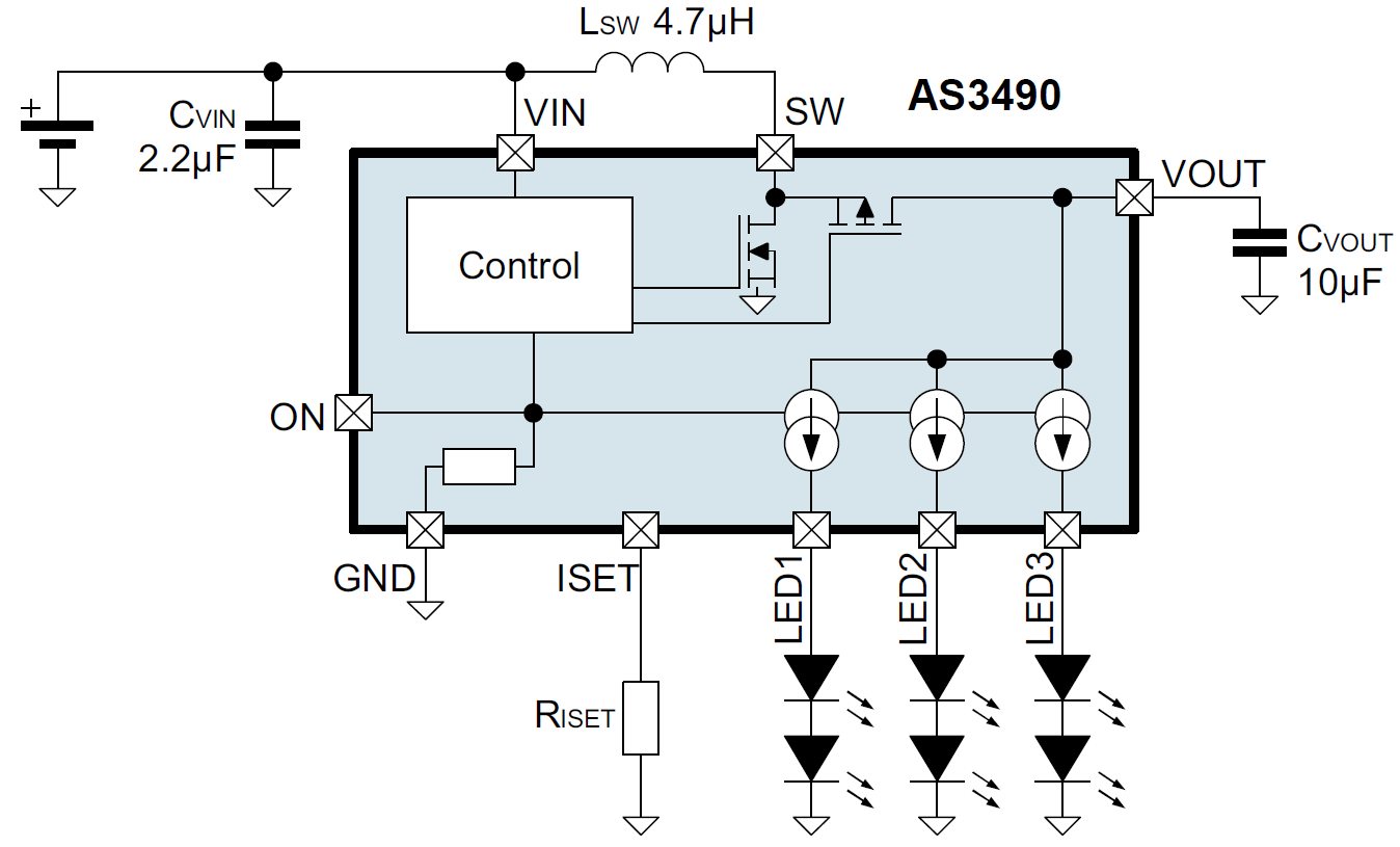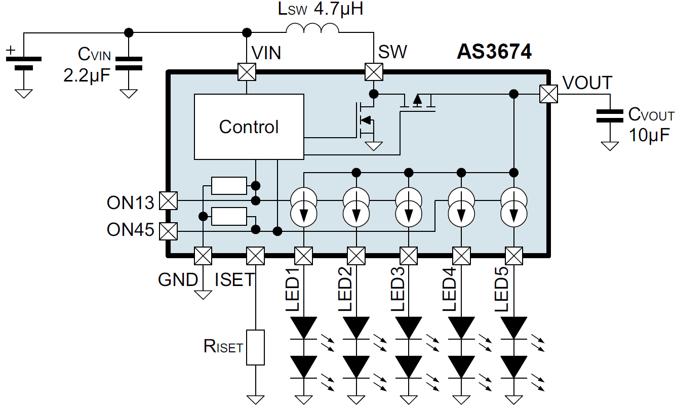 軟啟動(dòng)的特點(diǎn)使AS3674更容易集成到對(duì)噪音敏感的無(wú)線射頻系統(tǒng)中。AS3674由兩組輸入電路控制,也可用介于100-800赫茲的PWM電路控制,實(shí)現(xiàn)1:2000的調(diào)光比。單通道兩個(gè)LED的配置結(jié)合2 MHz的轉(zhuǎn)換器操作頻率,實(shí)現(xiàn)使用諸如4.7µH電感的微小外部組件并取得優(yōu)于競(jìng)爭(zhēng)對(duì)手最高達(dá)6%的高效率。
