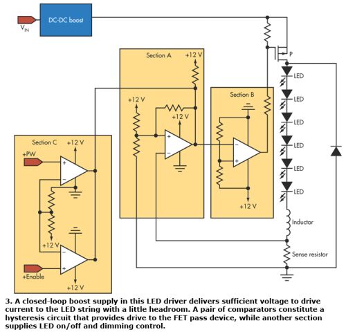 DC-DC升壓變換器是一個閉環(huán)升壓電源,它提供了足夠的電壓(至少2V的余量)來驅(qū)動流向LED串的電流。圖中A部分顯示了一個比較器及構(gòu)成正向滯后電路的相關(guān)電阻。圖中將感測電阻上的電壓與一個已知參考值作比較。圖中B部分給出了另一個比較器和用于緩沖A部分輸出相關(guān)電阻,以確保正確的滯后處理并驅(qū)動直通器件。