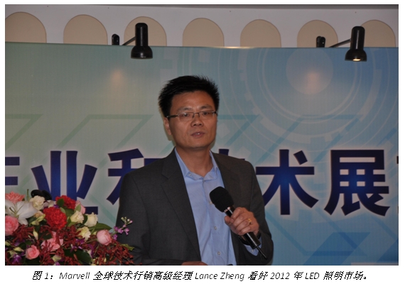 有業(yè)內(nèi)人士說,2011年LED庫存過大,會使2012年的市場不如2011年。對此觀點(diǎn),Marvell公司全球技術(shù)行銷高級經(jīng)理Lance Zheng有不同看法,“國內(nèi)裝機(jī)量非常多,這個是造成產(chǎn)能過剩的原因,但提高光效會是刺激LED行業(yè)發(fā)展的非常好的方式,因?yàn)楣庑б惶岣咚玫腖ED數(shù)量就會小,因此能降低成本,促進(jìn)LED市場發(fā)展。至于說2012年整個產(chǎn)業(yè)應(yīng)該還是保持增長,這里的亮點(diǎn)就是LED照明。”他在“2012產(chǎn)業(yè)和技術(shù)展望媒體研討會”上這樣表示。