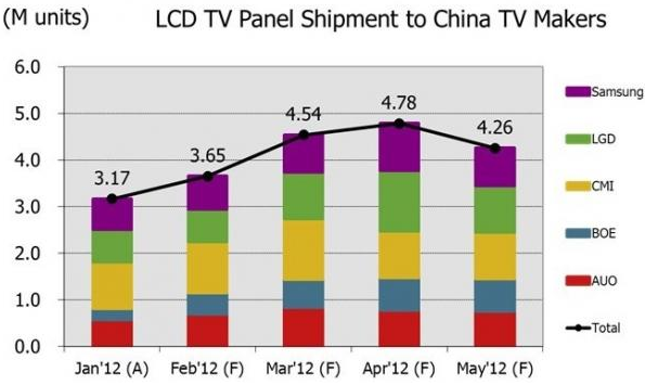 圖一、Jan’12-May’12電視面板出貨至大陸電視廠商的數(shù)量