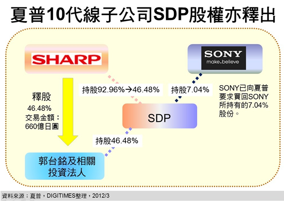 除此之外,黃銘章說明,夏普以10代TFT LCD產(chǎn)線(2,880mm×3,130mm)為主體的子公司Sharp Display Products (SDP),其46.48%股權(quán)也將出售給鴻海創(chuàng)辦人及董事長郭臺銘及相關(guān)投資人,屆時夏普及鴻海相關(guān)投資人將各持有SDP 46.48%股權(quán),剩余7.04%股權(quán)原由Sony持有,但3月28日Sony已要求夏普買回此一部分股份。