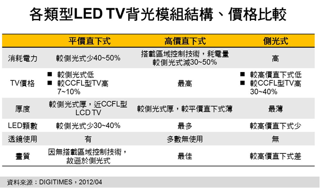 近期南韓TV業(yè)者如三星電子(Samsung Electronics)及樂金電子(LG Electronics)為吸引消費(fèi)者需求,開發(fā)出消耗電力較低、價格亦較低的直下式LED TV機(jī)種,價差與CCFL 型LCD TV拉近至10%以內(nèi)。