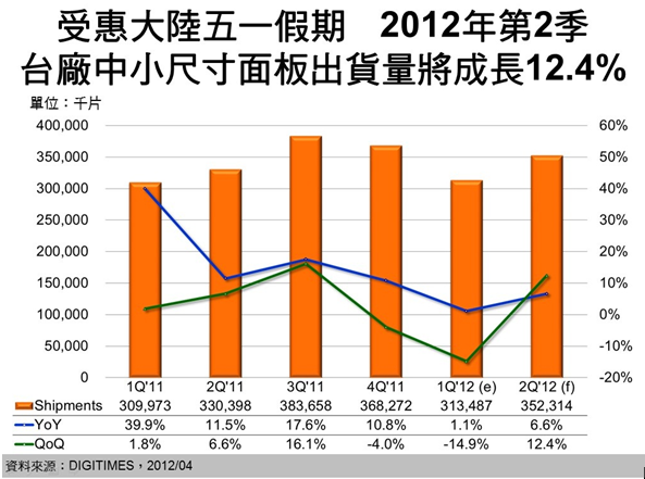 第2季為中小尺寸TFT LCD面板傳統(tǒng)旺季的開(kāi)始,其中,大陸五一假期需求更是第2季的主要市場(chǎng)動(dòng)力來(lái)源,DIGITIMES Research分析師楊仁杰分析,2012年第2季臺(tái)廠中小尺寸TFT LCD出貨量預(yù)估將為3.52億片,將較前季成長(zhǎng)12.4%。至于年成長(zhǎng)率,則受惠大陸手機(jī)市場(chǎng),尤其是智能型手機(jī)市場(chǎng)帶動(dòng),加上臺(tái)廠打入國(guó)際大廠7吋平板裝置、教育學(xué)習(xí)機(jī)、打印機(jī)等應(yīng)用,將較2011年第2季成長(zhǎng)6.6%。
