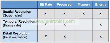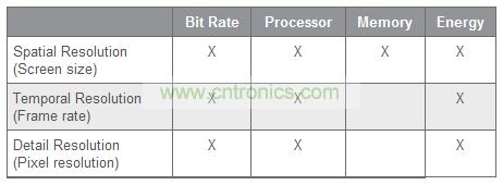 表 1 給出了不同視頻編碼參數(shù)對解碼設(shè)備所需資源選擇的大致影響。該表專門對采用運(yùn)動補(bǔ)償與離散余弦變換 (DCT) 技術(shù)實(shí)現(xiàn)視頻壓縮的基于塊的視頻編解碼器進(jìn)行了分析。