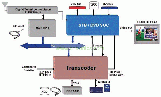 轉(zhuǎn)碼硬件必須與整個(gè) STB 系統(tǒng)中的其他系統(tǒng)進(jìn)行良好交互,其中包括數(shù)字調(diào)諧器、解多路復(fù)用器 (Demuxer) 和解調(diào)器、DDR2 存儲器、PCI 總線,以及向 STB SoC 傳輸音/視頻的高帶寬接口。圖 2 給出了常見的架構(gòu)示意圖,但這不一定是一般性架構(gòu)。