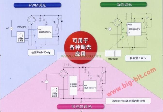 其主要特點(diǎn)是:可進(jìn)行可控硅/PWM/線性調(diào)光。適用于各種調(diào)光應(yīng)用(調(diào)光比0.2%-100%);內(nèi)置緩沖功能,照度變化平穩(wěn)(可選擇有緩沖、無緩沖);通過LED平均電流控制,可針對(duì)輸入電壓、輸入電壓變化,控制相應(yīng)的LED電流。這種對(duì)應(yīng)可控硅調(diào)光的LED照明用驅(qū)動(dòng)IC可用于兼容調(diào)光器的燈泡型LED照明、兼容調(diào)光器的LED筒燈照明和兼容調(diào)光器的LED基礎(chǔ)照明。