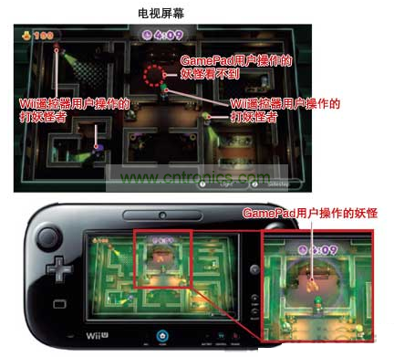在Wii U上,只有使用GamePad的用戶,才能在看著與電視上顯示內(nèi)容不同的信息玩游戲。比如,在打妖怪的迷你游戲“Luigi’s Ghost Mansion”中,手拿GamePad的用戶操作妖怪,手拿Wii遙控器的4名用戶負責打退妖怪。此時,手拿GamePad的用戶可在該屏幕上看到負責打妖怪的卡通人物的位置,而打妖怪的人卻看不到妖怪的位置。