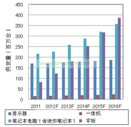未來(lái)的市場(chǎng)動(dòng)向方面,筆記本電腦市場(chǎng)的年增長(zhǎng)率有望達(dá)到10~15%左右,平板電腦市場(chǎng)將憑借低價(jià)格和輕便、應(yīng)用程序與智能手機(jī)的通用性,繼續(xù)保持大約30~40%的增長(zhǎng)率,到2016年,平板電腦的供貨量預(yù)計(jì)將超過(guò)筆記本電腦(圖1)。