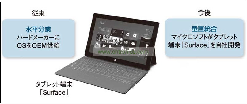 首先微軟發(fā)布了其自主開發(fā)的平板終端“Surface”,分為配備“Winodws 8”的機型和配備ARM處理器用“Windows RT”的機型,將與預(yù)定2012年內(nèi)發(fā)布的Windows 8同時發(fā)售。微軟長期采用向電腦廠商提供OS的水平分工模式,而此次卻在平板終端業(yè)務(wù)中采用了自行開發(fā)硬件的垂直整合模式(圖)。