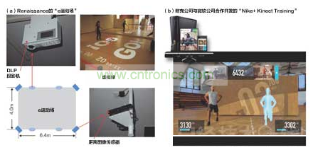 (a)是Renaissance經營的健身俱樂部設置的“e運動場”。使用投影儀把游戲畫面投影投影到訓練館中,用戶親身參與其中。人體動作使用距離圖像傳感器獲取。照片上是2位運動員相對而立,向對方球門射出虛擬球的“空氣曲棍球”游戲。(b)是耐克公司與微軟公司合作為“Xbox 330”開發(fā),支持Kinect的健身軟件“Nike+Kinect Training”的畫面示例。該軟件將檢測身體的動作,為目標提供有效訓練方式。