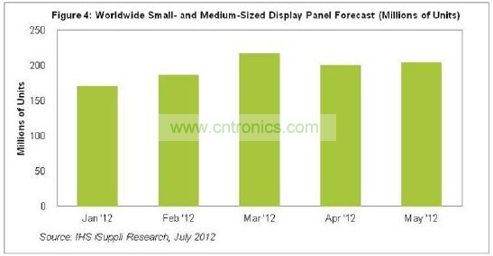5月份臺灣與韓國面板廠商的中小顯示器面板出貨量升至2.047億塊,扭轉(zhuǎn)了下滑局面。4月出貨量減少8%,至2.005億塊,如圖所示。這類面板主要用于手機、平板電腦和數(shù)碼相機。3月份出貨量達到2.175億塊,但4月份需求下降。5月出貨量增長顯示市場狀況好轉(zhuǎn),盡管幅度很小。