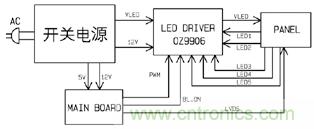 電視顯示系統(tǒng)包括電源板、主板、背光驅(qū)動(dòng)板等, 電源板提供VLED、12V給背光板,主板提供背光控制信號(hào)BL_ON和調(diào)光PWM信號(hào)給背光板。背光驅(qū)動(dòng)ICOZ9906 檢測(cè)PANEL內(nèi)部五條燈條的流過的電流,進(jìn)行定電流和電流平衡控制,點(diǎn)亮背光系統(tǒng)。