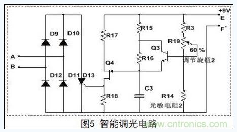 當LED照明設備開始工作后,本文設計的智能開關會依據(jù)環(huán)境照明情況的變化,通過智能調(diào)光電路自動地改變照明設備的亮度。圖1所示的智能調(diào)光電路接口A、B接入的電路如圖5所示。
