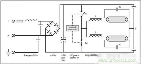 熒光燈的調光(1-10V)熒光燈的調光是在高頻電子鎮(zhèn)流器的基礎上研發(fā)出來的。下面是高頻電子鎮(zhèn)流器的線路圖:
