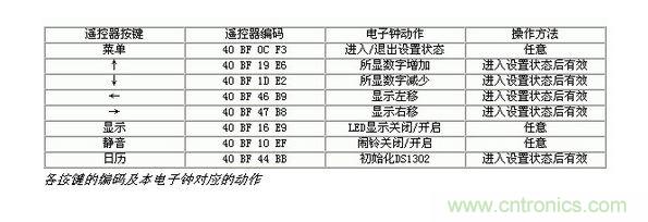 遙控器采用長虹彩電K11F型遙控器,遙控器按照16位地址碼,8位數(shù)據(jù)碼以及8位數(shù)據(jù)碼的反碼發(fā)送。表一列出了各按鍵的編碼及本電子鐘對應(yīng)的動作。如果采用其他遙控器,需對程序相應(yīng)部分的編碼作修改。
