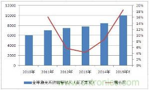 2010---2015年全球激光設備銷售規(guī)模(單位:百萬美元)