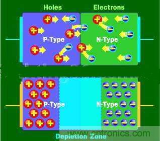 因此,電子空穴本身就顯示出是從正電區(qū)域流向負(fù)電區(qū)域。二極管是由N型半導(dǎo)體物質(zhì)與P型半導(dǎo)體物質(zhì)結(jié)合,每端都帶電子。這樣排列使電流只能從一個(gè)方向流動(dòng)。當(dāng)沒有電壓通過二極管時(shí),電子就沿著過渡層之間的匯合處從N型半導(dǎo)體流向P型半導(dǎo)體,從而形成一個(gè)損耗區(qū)。在損耗區(qū)中,半導(dǎo)體物質(zhì)會(huì)回復(fù)到它原來的絕緣狀態(tài)--所有的這些“電子空穴”都會(huì)被填滿,所有就沒有自由電子或電子真空區(qū)和電流不能流動(dòng)。