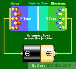 如果嘗試使電流向其它方向流動(dòng),P型端就邊接到電流負(fù)極和N型連接到正極,這時(shí)電流將不會(huì)流動(dòng)。N型物質(zhì)的負(fù)極電子被吸引到正極電子。P型物質(zhì)的正極電子空穴被吸引到負(fù)極電子。因?yàn)殡娮涌昭ê碗娮佣枷蝈e(cuò)誤的方向移動(dòng)所以就沒有電流流通過匯合處,損耗區(qū)增加。