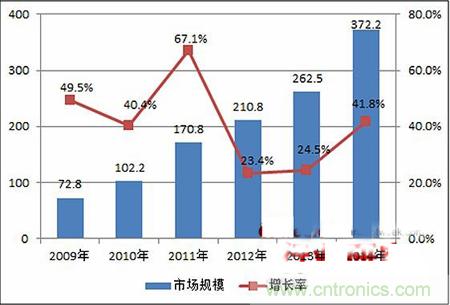 圖表5 2009-2014年中國IDC行業(yè)市場規(guī)模及增長(單位:億元,%)