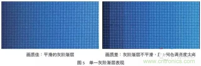 小點間距LED顯示屏為時序掃描式(multiplexed)的顯示器,非液晶屏幕的hold-type顯示器,所以刷新率對于小點間距LED顯示屏來說相當?shù)刂匾?,較低的刷新率不僅會使小點間距LED顯示屏觀賞起來有閃爍的不適感,容易使造成觀賞者暈炫,而且會使灰階漸層的效果不平滑。以圖4為例,右圖臉部的灰階漸層效果較左圖的不平滑,有類似等高線的現(xiàn)象,從圖5的灰階漸層測試畫面也可以看出右圖的小點間距LED顯示屏的連續(xù)性比左圖的差。
