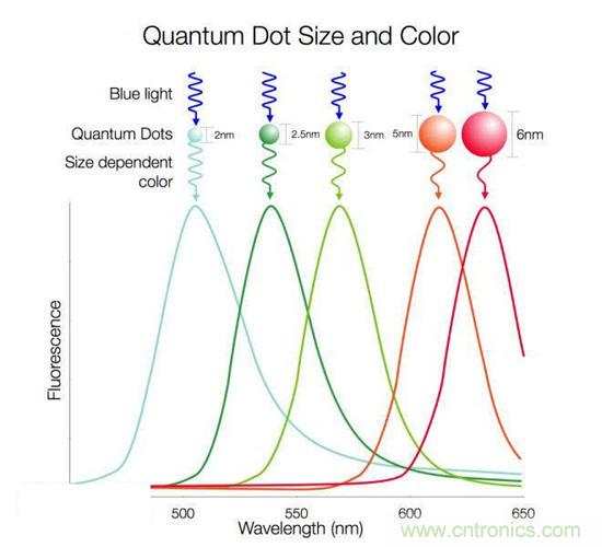 而傳說中的量子點顯示技術(shù)就是對背光方案做出變革:所謂的量子點,可以簡單認為是長寬高都在100nm以下的材料(幾個原子的大?。?,這種極小的半導(dǎo)體晶體在激發(fā)后可以發(fā)光,至于究竟是怎么發(fā)光的,那是科學(xué)研究范疇,這里不做討論。比較靠譜的一個結(jié)論是,量子點的大小,與其所發(fā)出光的能量強度(波長)成正比。也就是說,量子點的直徑越小,激發(fā)后的光波長越短,也就是顏色偏藍,直徑越大則激發(fā)后的光波長越長,也就是顏色偏紅。