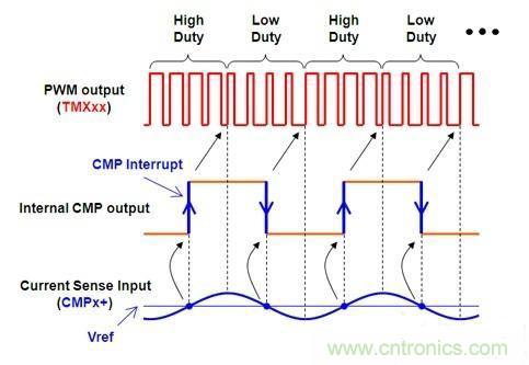 對于開關(guān)電源,PWM占空比決定輸出電壓,如圖3,電路開始工作后,LED電流經(jīng)采樣后加到MCU內(nèi)置比較器端口,和參考值進(jìn)行比較,產(chǎn)生中斷信號,來調(diào)整PWM的占空比,其變化過程見圖4,如當(dāng)電流大于參考值時,降低占空比;反之,提高占空比,最終達(dá)到一個負(fù)載電流動態(tài)穩(wěn)定的狀態(tài)。