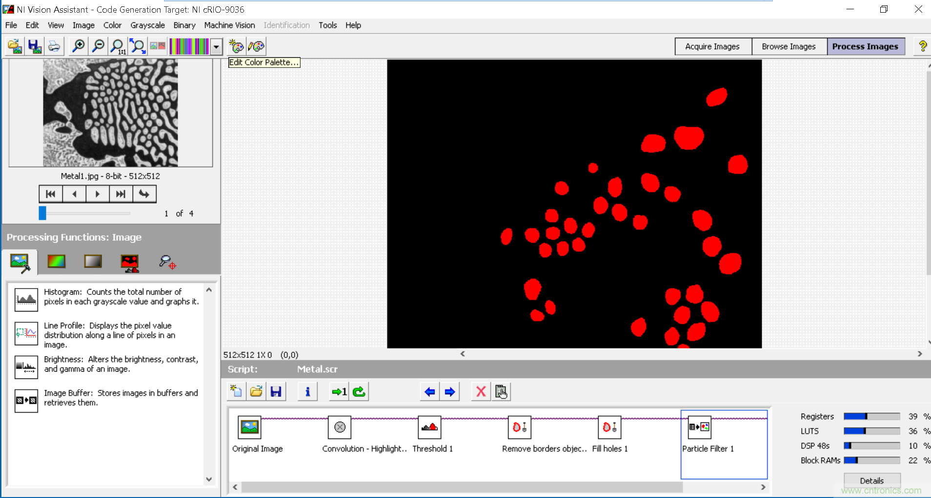 為了實(shí)現(xiàn)生產(chǎn)率的最大化,不論使用哪種處理平臺(tái),都需要立即獲得關(guān)于算法的反饋和基準(zhǔn)測試信息。當(dāng)使用迭代探索性方法時(shí),實(shí)時(shí)查看算法結(jié)果將會(huì)節(jié)省大量時(shí)間。什么是正確的閾值?用二進(jìn)制形態(tài)濾波器剔除的顆粒多大或多???哪種圖像預(yù)處理算法和算法參數(shù)可以最好地清理圖像?這些都是開發(fā)視覺算法時(shí)的常見問題,而關(guān)鍵在于是否能夠更改并快速查看結(jié)果。然而,傳統(tǒng)的FPGA開發(fā)方法可能會(huì)減緩創(chuàng)新,因?yàn)樗惴ǖ拿總€(gè)設(shè)計(jì)變化之間需要編譯時(shí)間。克服這一點(diǎn)的一個(gè)方法是使用一個(gè)算法開發(fā)工具,可讓您在同一個(gè)環(huán)境進(jìn)行CPU和FPGA的開發(fā)工作,而不會(huì)在FPGA編譯時(shí)陷入困境。NI Vision Assistant是一種算法工程工具,用于開發(fā)部署到CPU或FPGA上的算法,以幫助您簡化視覺系統(tǒng)設(shè)計(jì)。您還可以使用Vision Assistant在目標(biāo)硬件上編譯和運(yùn)行之前測試算法,同時(shí)輕松訪問吞吐量和資源利用率信息。