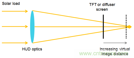 圖 2:HUD光學(xué)器件將太陽(yáng)能負(fù)載放大到散射屏或薄膜晶體管(TFT)面板上