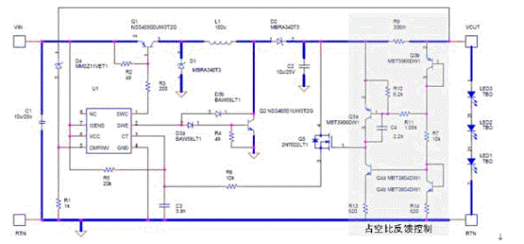 除了單純的降壓或升壓拓撲結構,在某些環(huán)境下,也需要降壓-升壓拓撲結構,如從標準電源輸入端驅動LED串;此外,在輸入電壓和LED負載電壓交疊的場合中使用這種拓撲結構也很常見。而NCP3065也能夠配置為降壓-升壓控制器。這種架構需要2個電源開關。雖然NCP3065本身也包含1個電源開關,但我們可以使用1個低VCEsat PNP/NPN對管來獲得更高轉換效率。這是一種可擴展的方案,整流器和電源開關都能夠根據(jù)具體的輸入和輸出電壓以及電流電平來調整。值得一提的是,諸如NSS40500UW3這樣的低VCEsat晶體管采用小巧的2×2 mm封裝,提供極佳的性能。