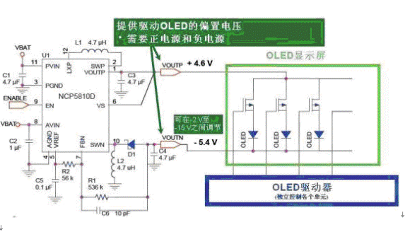 圖5:安森美半導體AMOLED穩(wěn)壓電源IC NCP5810D的功能框圖。