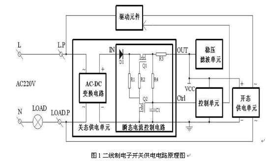 基于以上問題,本文提供了一種用于二線制電子開關的供電電路,在開關關閉時給控制電路提供很小的電流,用以維持待機工作,開關開啟的瞬間,先由控制單元控制關態(tài)供電單元,提供較大的工作電流給控制單元和驅動元件,使開關開啟,然后轉入開態(tài)供電狀態(tài)。當開關關閉時,控制單元控制關態(tài)供電單元提前進入大電流工作狀態(tài),迅速補充開關關閉瞬間控制單元和驅動元件消耗的功率,使電源濾波電容兩端的電壓維持在額定值。有效地解決了負載燈具閃爍的問題。