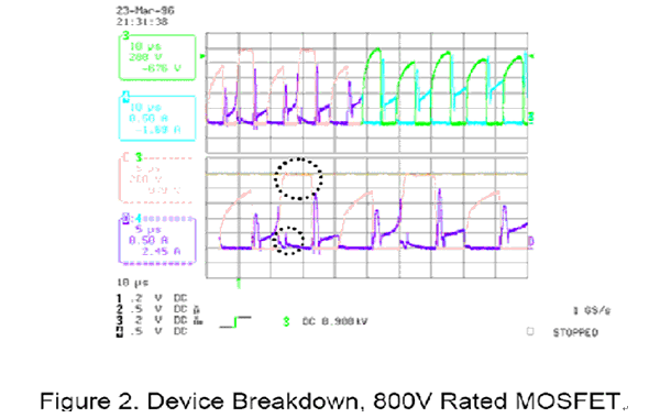 當(dāng)場(chǎng)效應(yīng)晶體管進(jìn)入崩潰效應(yīng)時(shí) Drain 及 Source 電壓會(huì)被嵌制在其崩潰電壓 , 而電流會(huì)經(jīng)由寄生的二極管而產(chǎn)生逆向操作電流的現(xiàn)象。如圖二所示為一典型開關(guān)式電源電路所量測(cè)到的崩潰現(xiàn)象。從圖中可看出 Drain 及 Source 的電壓 (CH3) 被箝制在 1KV 而且逆向電流 (CH4) 可清楚地被發(fā)現(xiàn)。