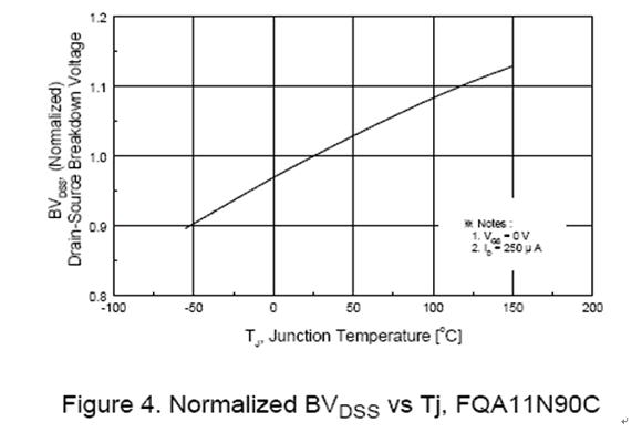 一般而言 假使 Drain 及 Source 電壓超過規(guī)格書所載明的最大額定電壓稍大一些 , 此時(shí)要讓場(chǎng)效應(yīng)晶體管產(chǎn)生崩潰現(xiàn)象其實(shí)是不常發(fā)生的。圖四所表示的曲線為場(chǎng)效應(yīng)晶體管的額定最大工作電壓 (BVDSS) vs 接合面溫度 (Tj), 其特性的表示是以正溫度特性變化 。當(dāng)接合面溫度達(dá)到 120 ° C 時(shí) , BVDSS 可達(dá)到將近 990V 。由此可知 , 在更高的接合面溫度條件下 , 場(chǎng)效應(yīng)晶體管需要更高的 Drain 對(duì) Source 的電壓以達(dá)到崩潰效應(yīng)產(chǎn)生的必要條件。